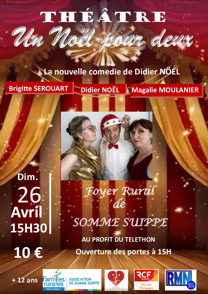 l'association Familles Rurales vous invite à venir assister à une pièce de théatre "un noël pour deux" le dimanche 26 avril à 15H30 au foyer rural.