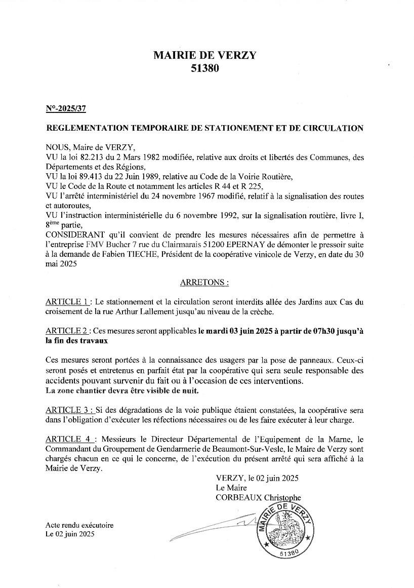 Arrêté De Circulation Et Stationnement Le 3 Juin 02/06/2025 La circulation et le stationnement seront interdits allée des jardins au cas, de la rue Arthur Lallement jusqu'à la crèche le 3 juin à partir de 7h30 et jusqu'à la fin des travaux prévus à la coopérative.