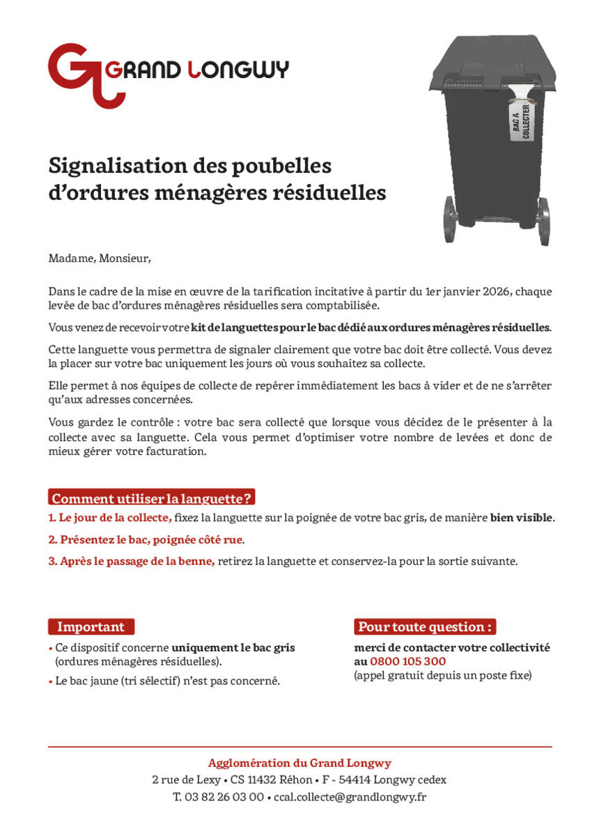 Rappel de la CAL : les languettes sont obligatoires : elles permettent de signaler que le bac d'ordures ménagères est bien présenté à la collecte. En l'absence de languette, le bac ne pourra pas être collecté.
