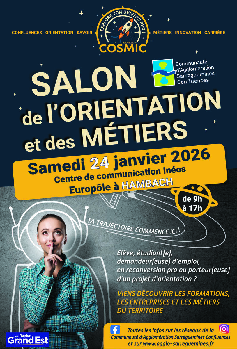 La Communauté d'Agglomération de Sarreguemines Confluences organise le samedi 24 janvier 2026 au Centre de Communication Inéos Europôle à Hambach, un salon de l'orientation et des métiers de 9h à 17h.