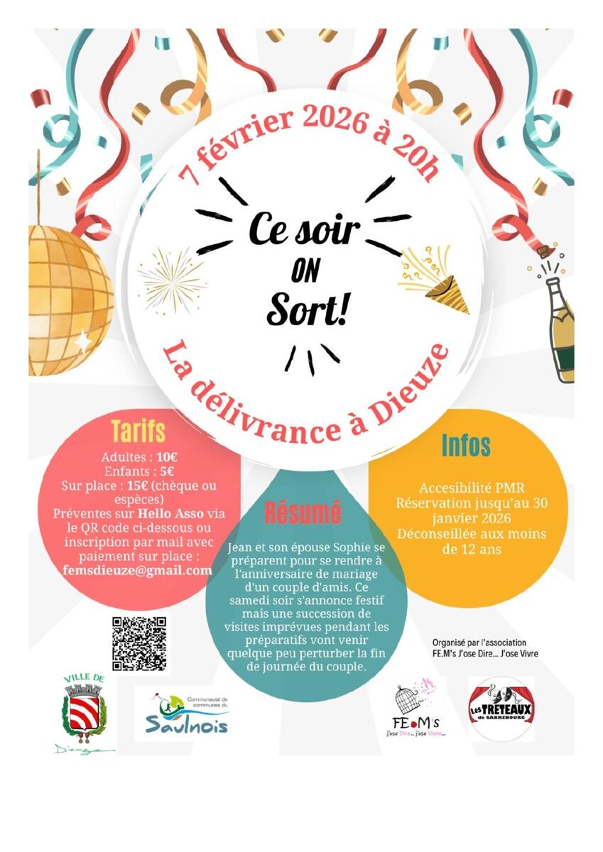 ℹ️ Réservation jusqu'au 30 janvier avec billeterie sur place ou réservation en ligne via HelloAsso (https://www.helloasso.com/associations/fem-s-j-ose-dire-j-ose-vivre/evenements/theatre-ce-soir-on-sort) ou inscription par mail (femsdieuze@gmail.com)