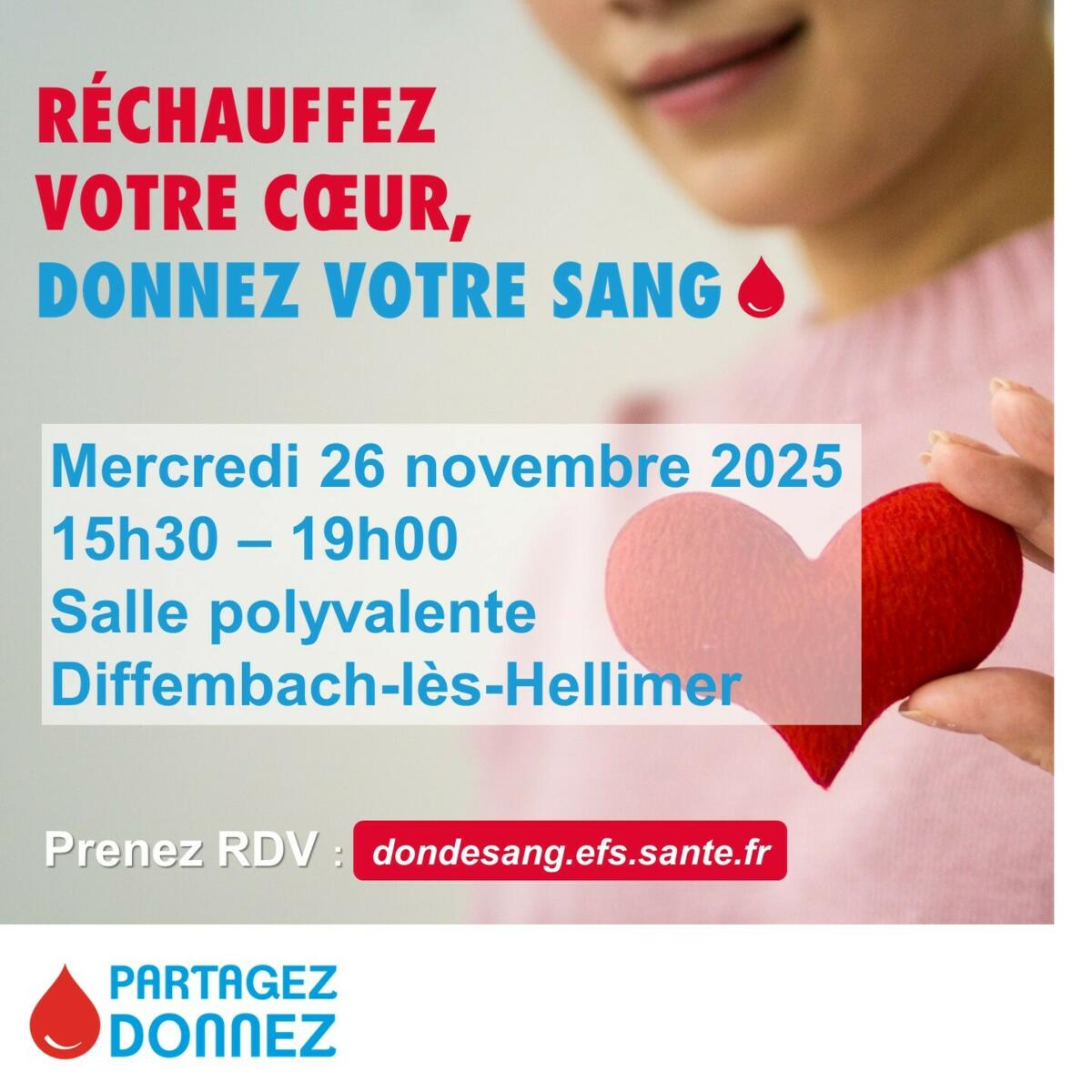 La prochaine collecte de sang à Diffembach-lès-Hellimer se déroulera le mercredi 26 novembre 2025 à la Salle Polyvalente de 15h30 à 19h00.
