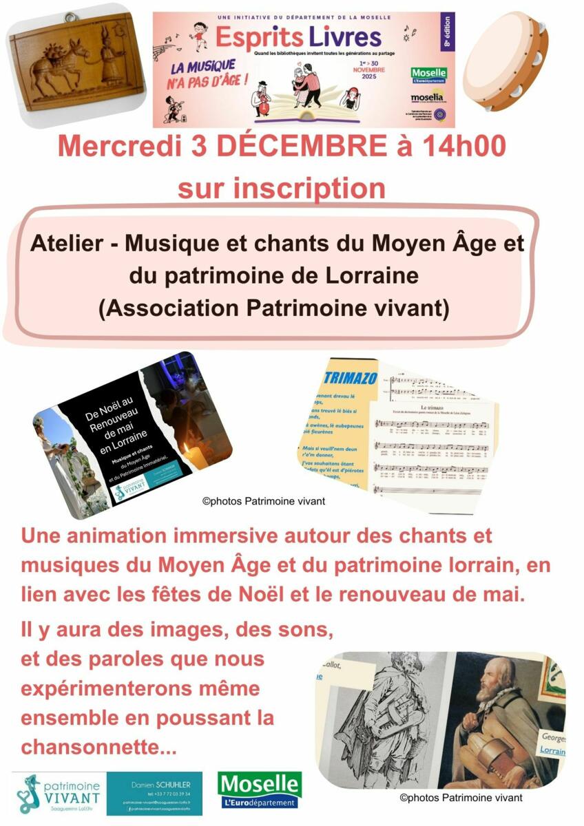 Atelier Autour De La Musique 21/11/2025 La bibliothèque, vous propose une animation autour de la musique offerte par le Département de la Moselle le mercredi 3 décembre à 14h00 sur inscription.