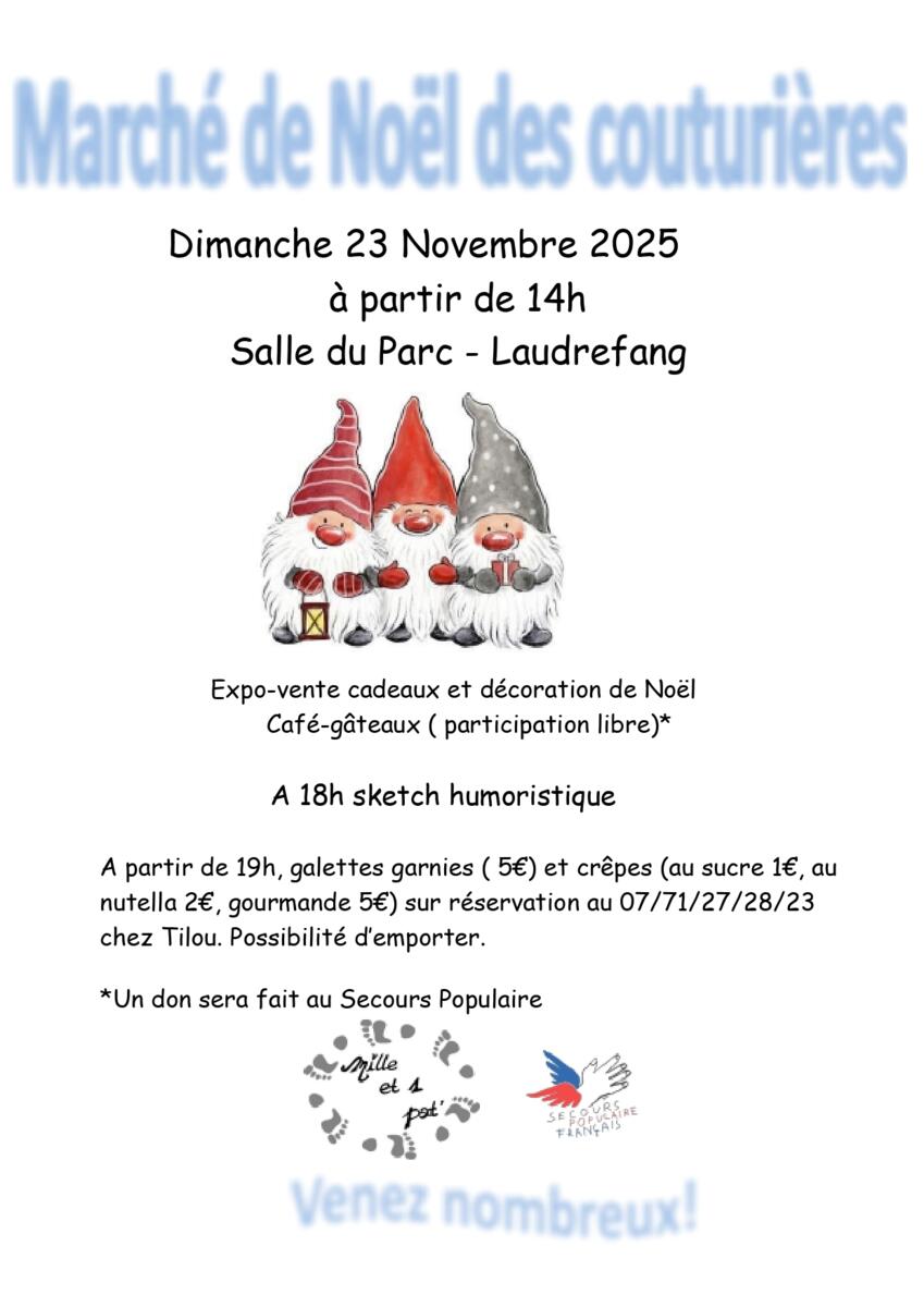 Marché De Noël Des Couturières 12/11/2025 Le marché de Noël des couturières se déroulera Dimanche 23 novembre 2025 à partir de 14h à la salle du Parc.