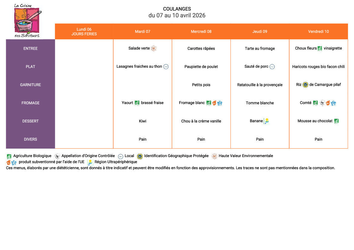 Menus Scolaires et Centre de Loisirs du 30 mars au 17 avril
