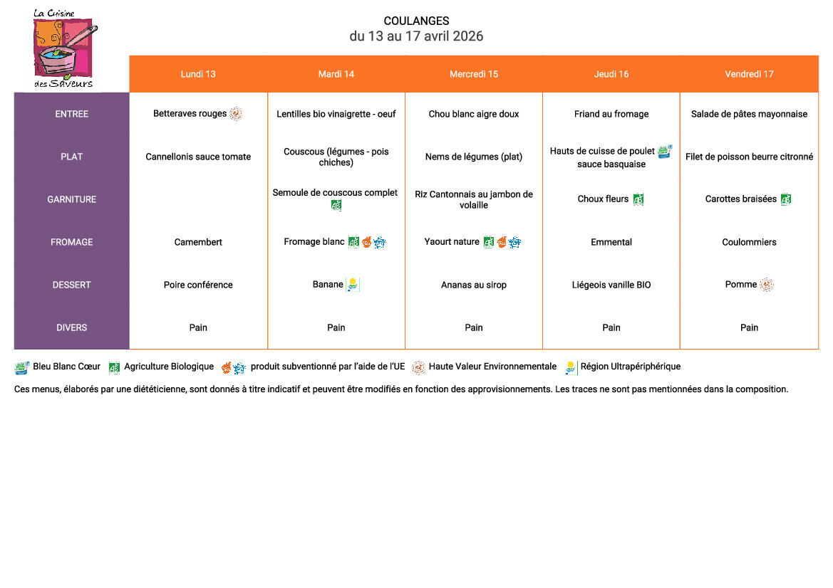 Menus Scolaires et Centre de Loisirs du 30 mars au 17 avril 26/03/2026 Menus Scolaires et Centre de Loisirs du 30 mars au 17 avril