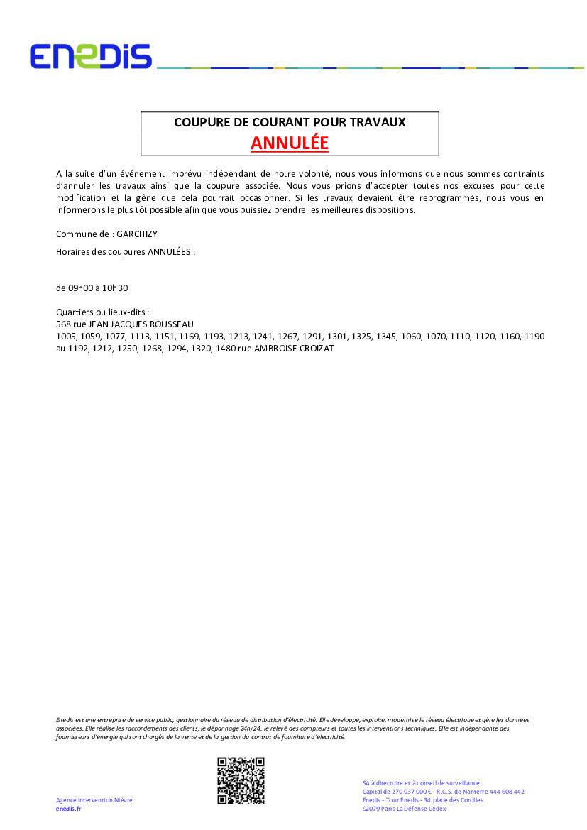 Votre mairie / Actualités / ⚡ Coupure de courant par Enedis annulée