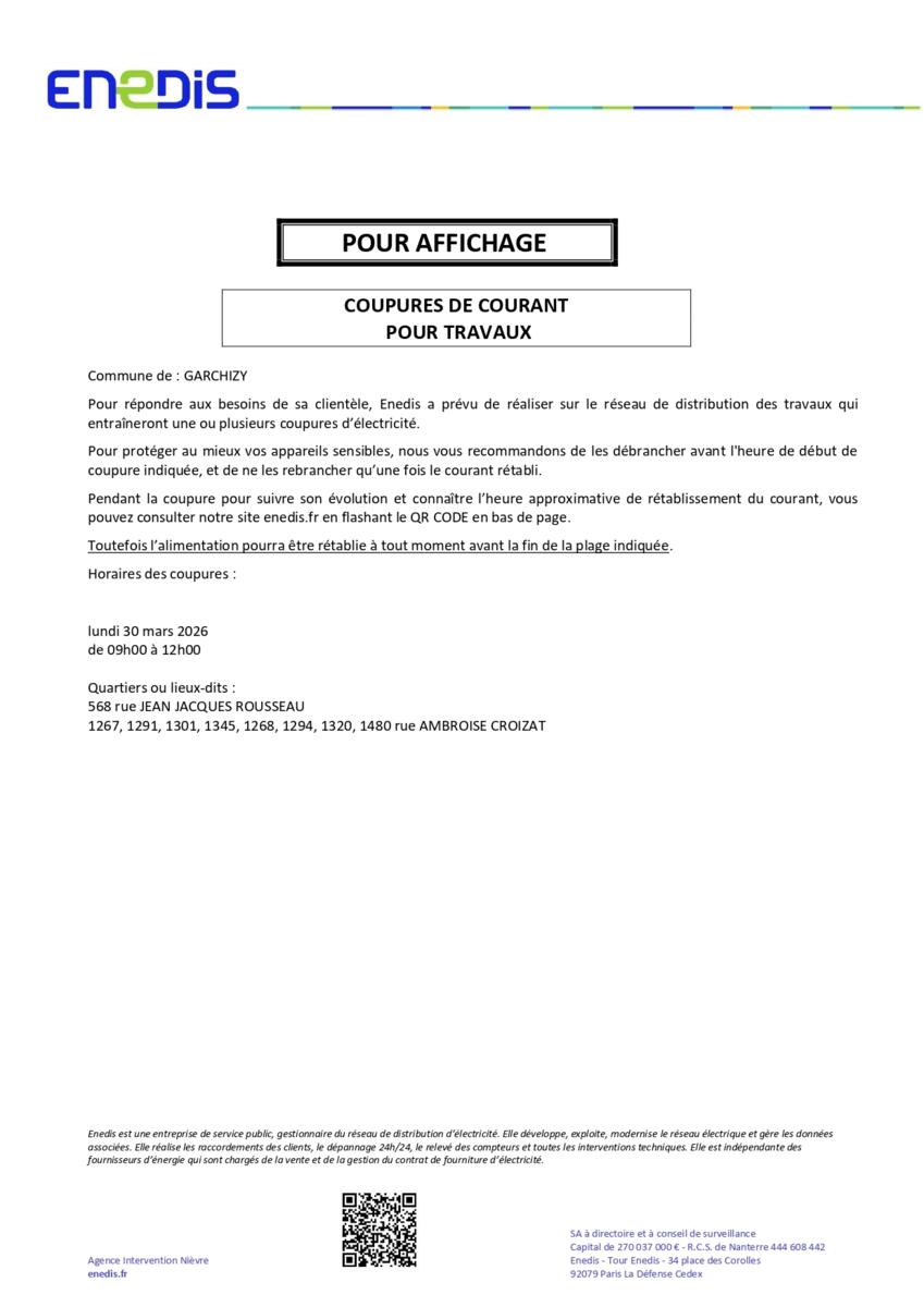 Coupure de courant pour travaux le lundi 30 mars de 09 h à 12 h, aux adresses suivantes :