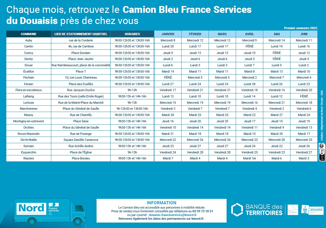 Le Camion bleu France Services va à la rencontre des habitants du Douaisis pour leur proposer un service de proximité et les accompagner pour de nombreuses formalités à accomplir (Pole Emploi, CAF, CPAM, CARSAT, etc.).