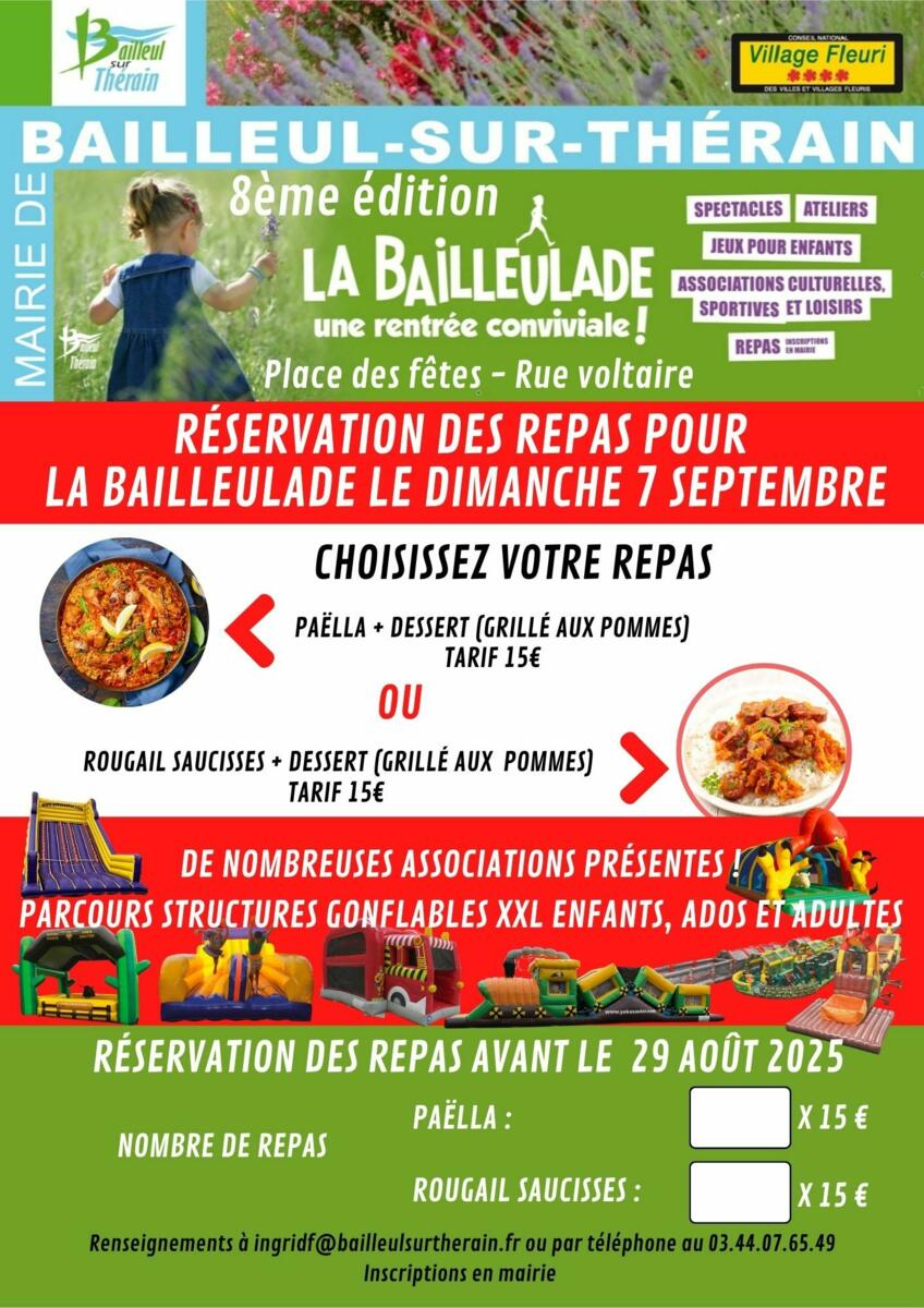 Comme chaque année, nous vous proposons de vous restaurer le jour de notre manifestation LA BAILLEULADE. Elle aura lieu cette année le dimanche 7 septembre. Vous pouvez d'ores et déjà vous inscrire en mairie jusqu'au 29 août. NE TARDEZ PAS