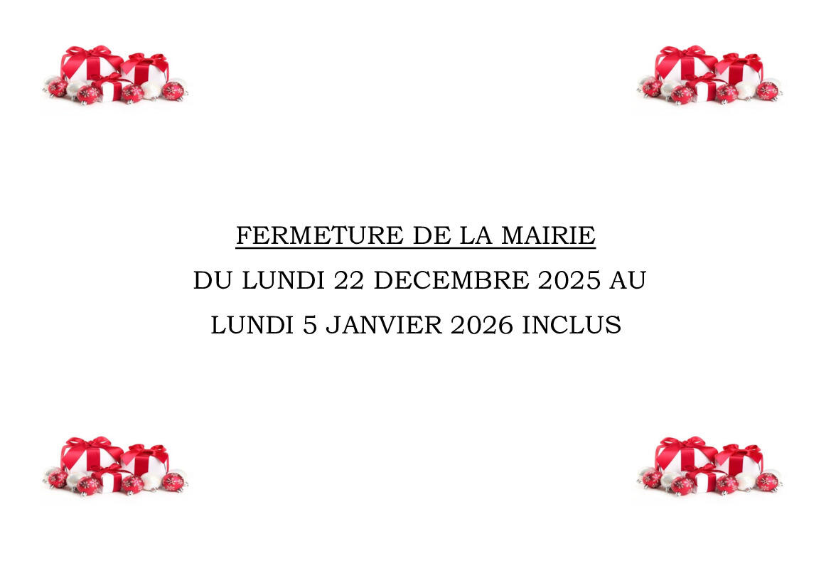Fermeture De La Mairie 18/12/2025 Bonjour, pour la période de fin d'année, la mairie sera fermée. Nous vous souhaitons de belles fêtes !! L'équipe municipale.
