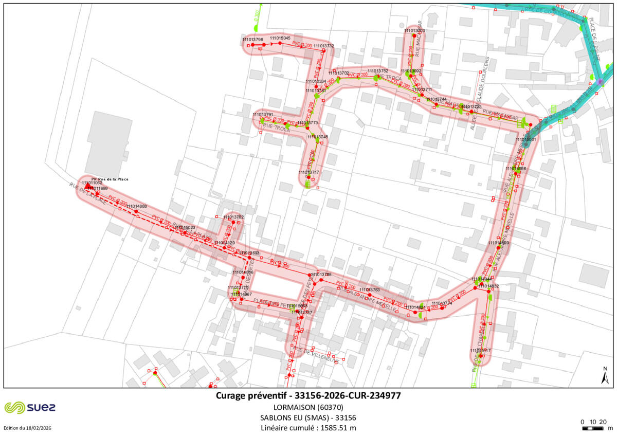 La société SANET a été mandaté par la Sté SUEZ, pour effectuer le curage de certains réseaux d’ Eaux usées et Eaux pluviales se trouvant sur la commune de LORMAISON (voir plans joints) .