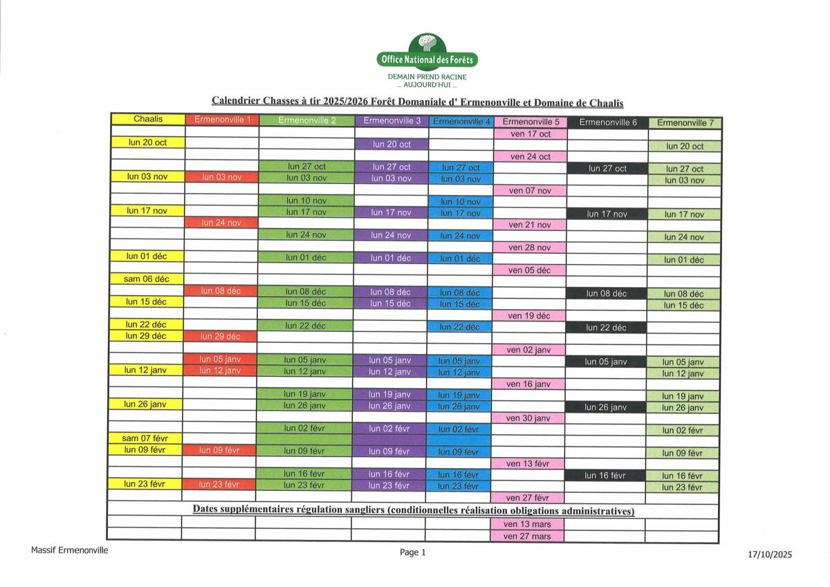 CALENDRIER CHASSES A TIR 2025/2026 - FORÊT D'ERMENONVILLE