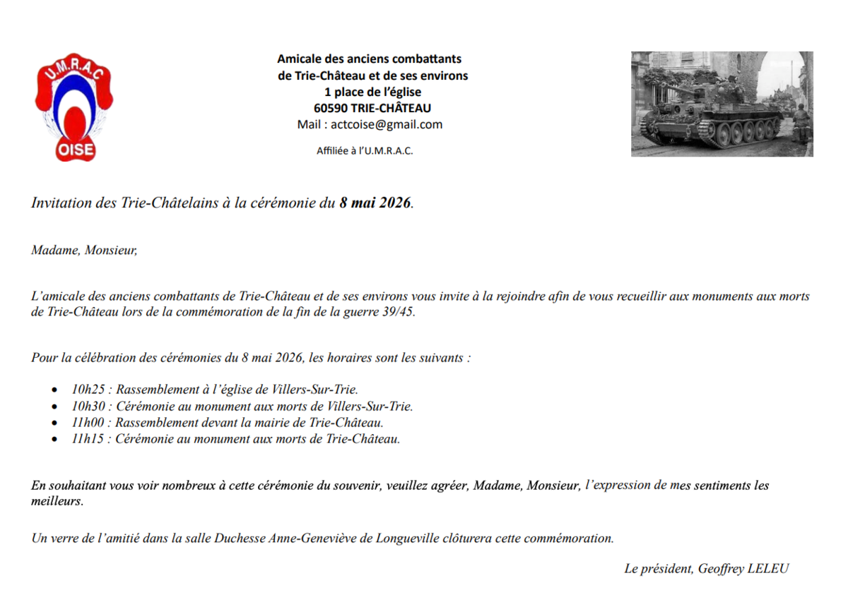 Cérémonie Du 8 Mai 27/04/2026 Nous espérons vous y voir nombreux pour honorer la mémoire de nos combattants.