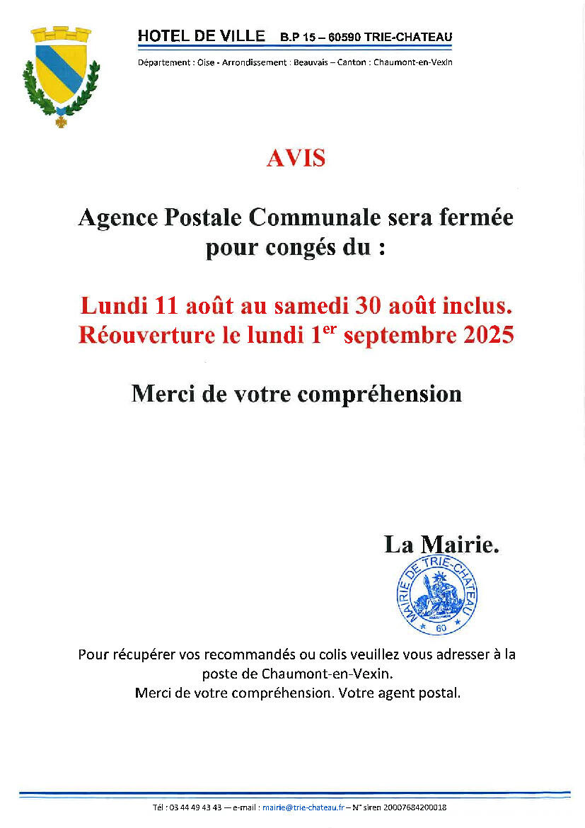 Votre mairie / Actualités / Fermeture de l'agence postale de Trie-Château