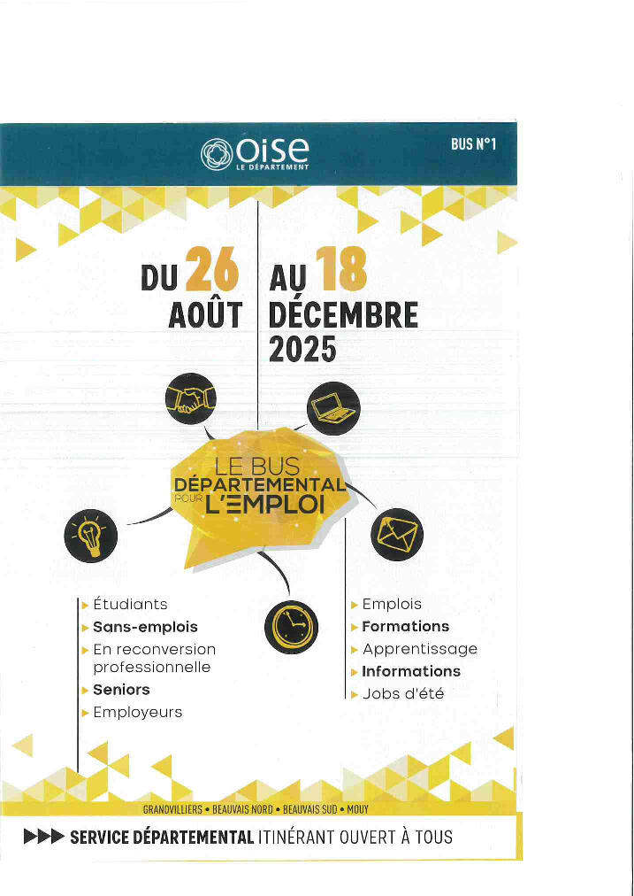 La prochaine permanence du bus départemental pour l'emploi est prévue le 27 Août 2025 de 9h à 12h30 sur la Place communale.