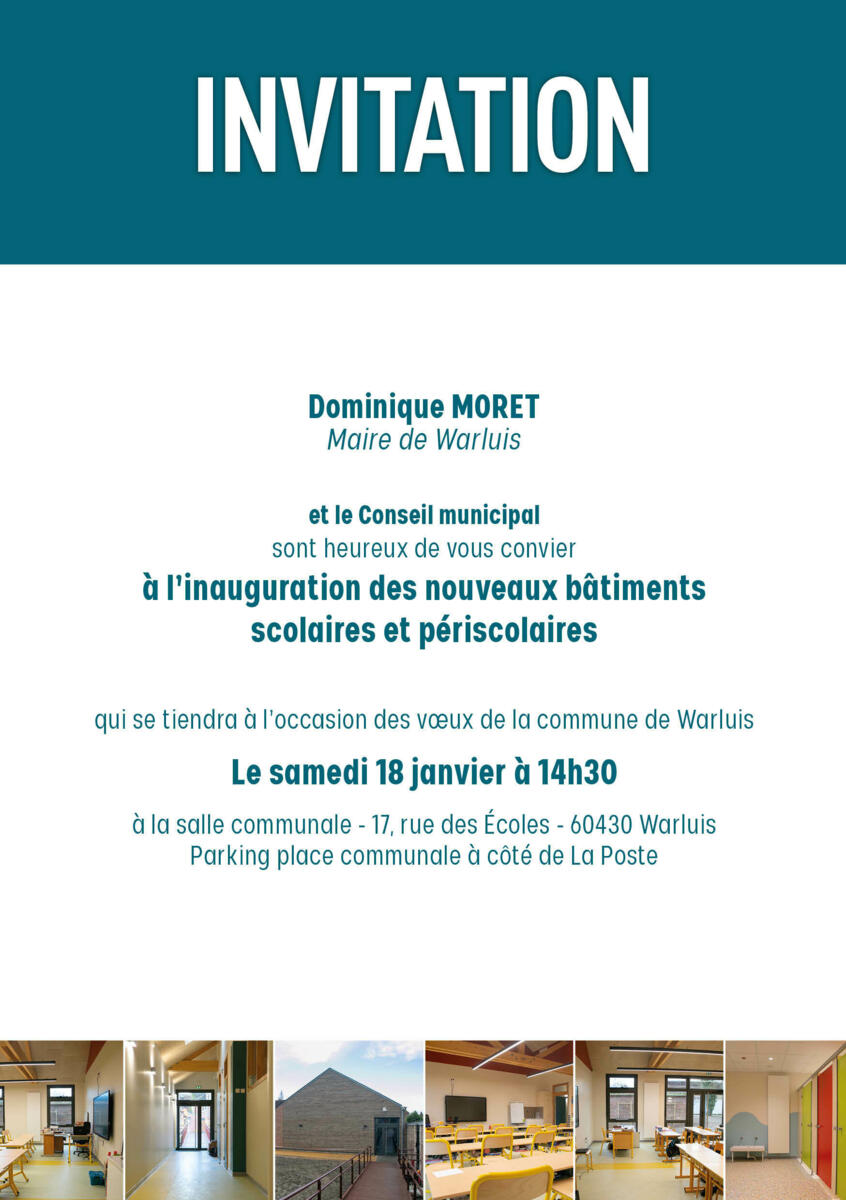 Madame le Maire et les conseillers municipaux vous invitent à l'inauguration des nouveaux bâtiments scolaires et périscolaires qui se déroulera le 18 janvier 2025 à 14h30 lors de la cérémonie des voeux 2025 à la salle communale.