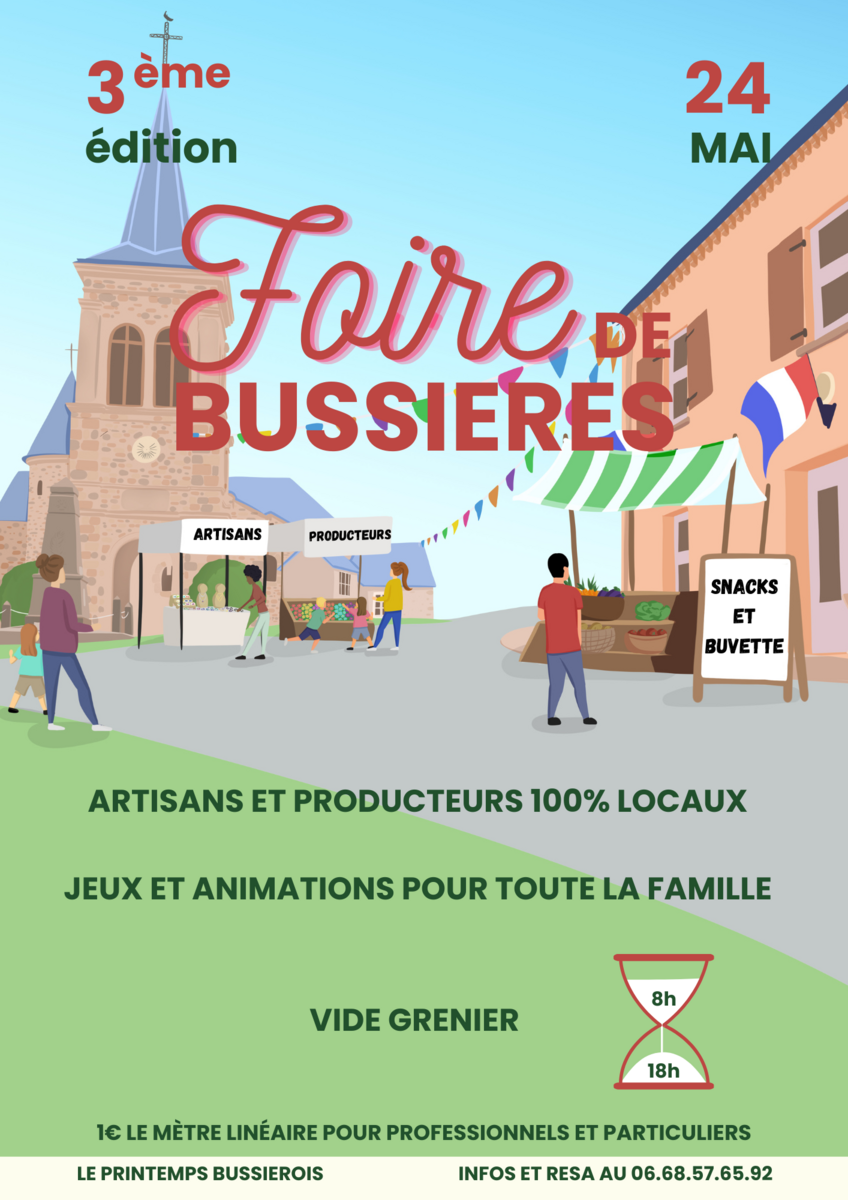 Nous avons le plaisir de vous inviter à participer à la troisième édition de la Foire de Printemps de Bussières, un événement convivial et incontournable qui se tiendra le 24 mai prochain dans le bourg de Bussières. Vous trouverez ci-dessous toutes les informations nécessaires pour vous inscrire.