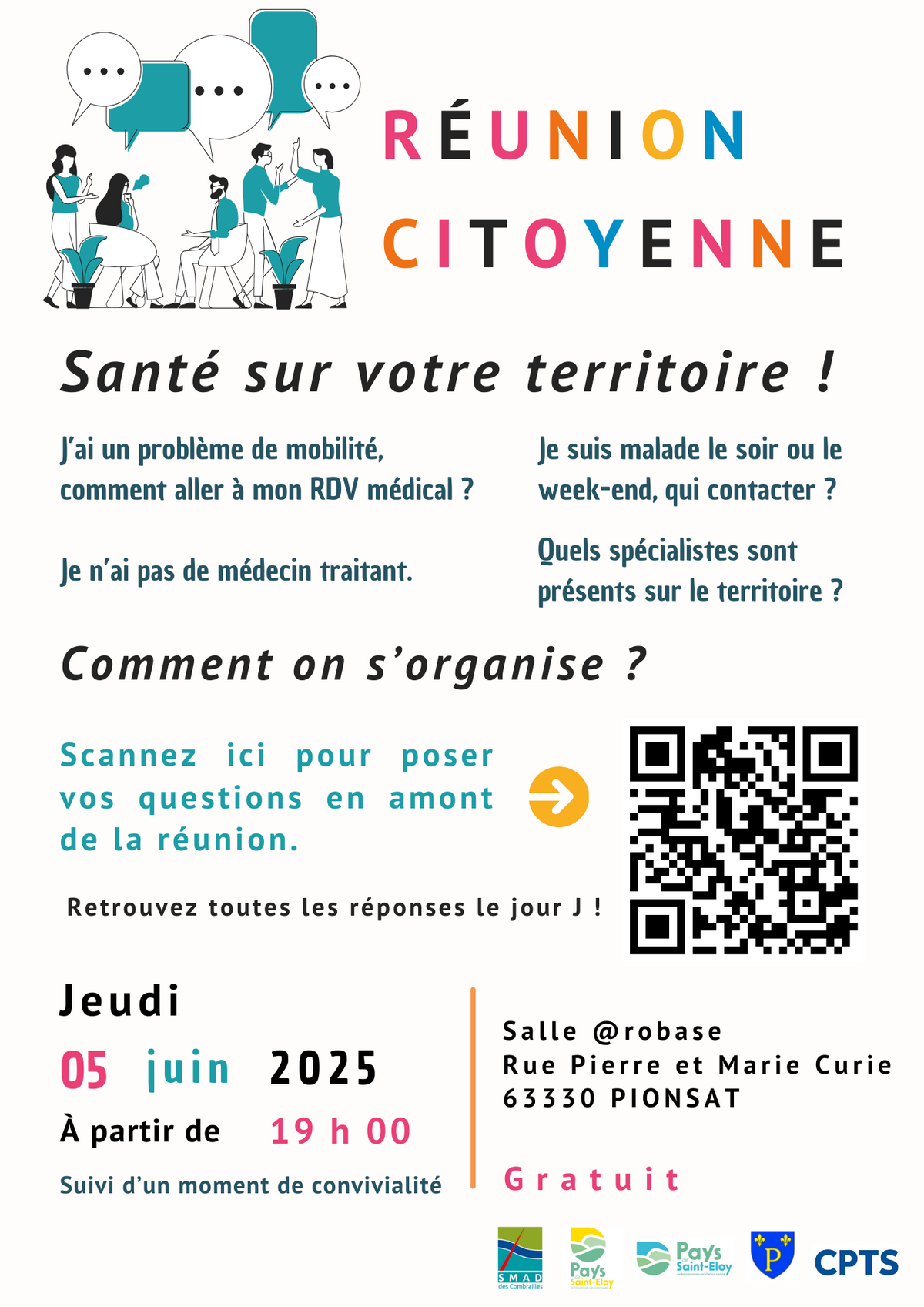 Le SMADC, en partenariat avec la communauté de communes du Pays de St Eloy, la mairie de Pionsat et les professionnels de santé du territoire organise une réunion citoyenne le jeudi 5 juin 2025 à 19h à la salle arob@se à Pionsat afin d’inviter la population à venir échanger avec les professionnels de santé et les élus locaux.