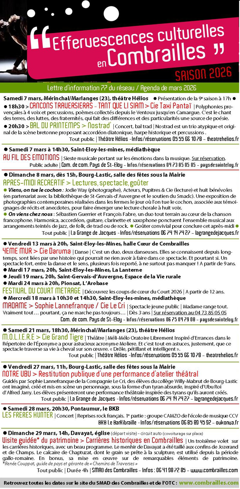 Effervescences culturelles en Combrailles. Mars 2026. 27/02/2026 Cliquer sur le visuel ci-dessus pour accéder à la plaquette complète.