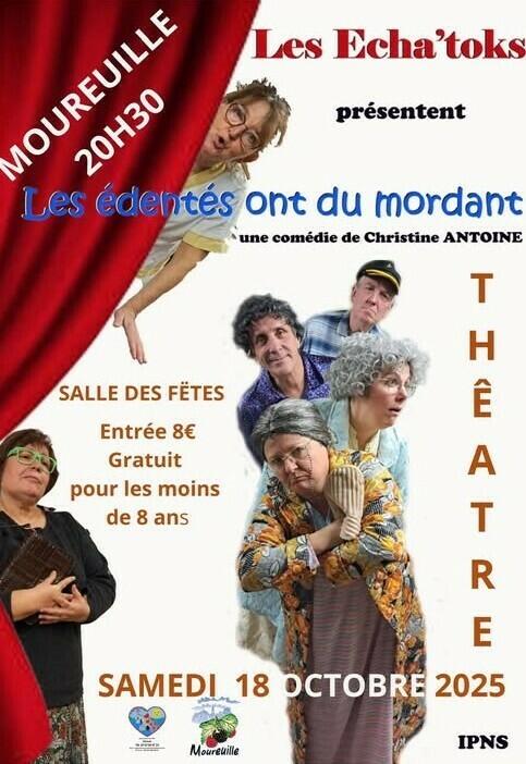 La seconde pièce délocalisée répond au titre de « les édentés ont du mordant », pièce écrite par Christine Antoine. Elle sera jouée à Moureuille le samedi 18 octobre à 20h30 par la compagnie les Echa’toks. Une belle histoire sur la vie d’un Ephad familial. L’organisateur, les petits cœurs Menatois, association carritative, organise avant la pièce la remise d’une synthèse oculaire à la petite Cloé qui a pu être acquise grâce aux fonds collectés lors de précédentes actions. Le spectacle joué à Moureuille présente également un objectif carritatif pour venir en aide à un jeune atteint d’un cancer, hospitalisé à Clermont et qui a besoin d’un ordinateur pour suivre ses cours.