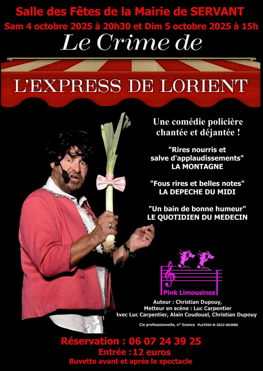 Les deux pièces de théâtre qui auraient dû se tenir au foyer rural de Menat sont déplacées vers des communes voisines. En effet, les travaux d’amélioration de celui-ci viennent de débuter et rendent la salle impraticable. En conséquence, les deux représentations du crime de l’express de Lorient jouées par la compagnie Pink Limousines seront données à la salle des fêtes de Servant, la première le samedi 4 octobre à 20h30, la seconde le dimanche 5 octobre à 15 heures. Cette enquête complètement déjantée pourra donc être résolue, le tout en chanson. Rires assurés du début à la fin, de nombreux rebondissement attendent le public. Il faut saluer la bonne entente des deux maires qui ont permis la tenue de ce spectacle à l’initiative de la commune de Menat.