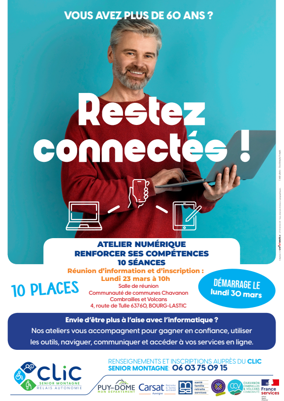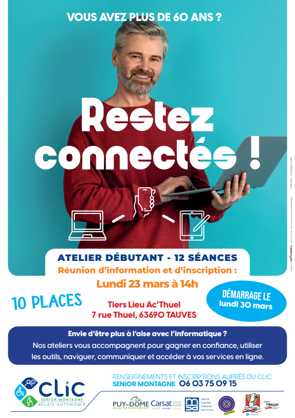 Renseignements et inscriptions auprès du CLIC Senior Montagne au 06 03 75 09 15 ou par mail à louise.faure@coordination-issoire.fr .