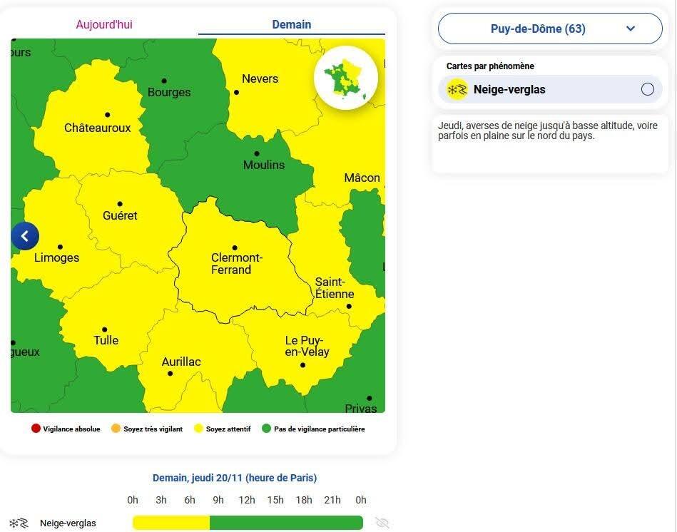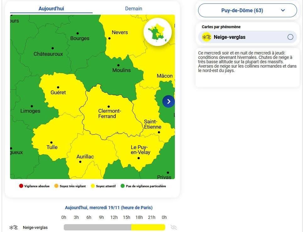 Météo-France maintient le département au niveau de vigilance JAUNE pour le risque NEIGE-VERGLAS jusqu'à demain, jeudi 20 novembre, 8h.