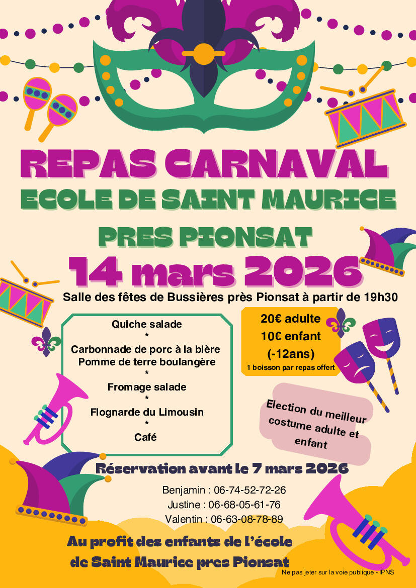 🃏 Repas carnaval de l'école Bussières Près Pionsat 14/03/26