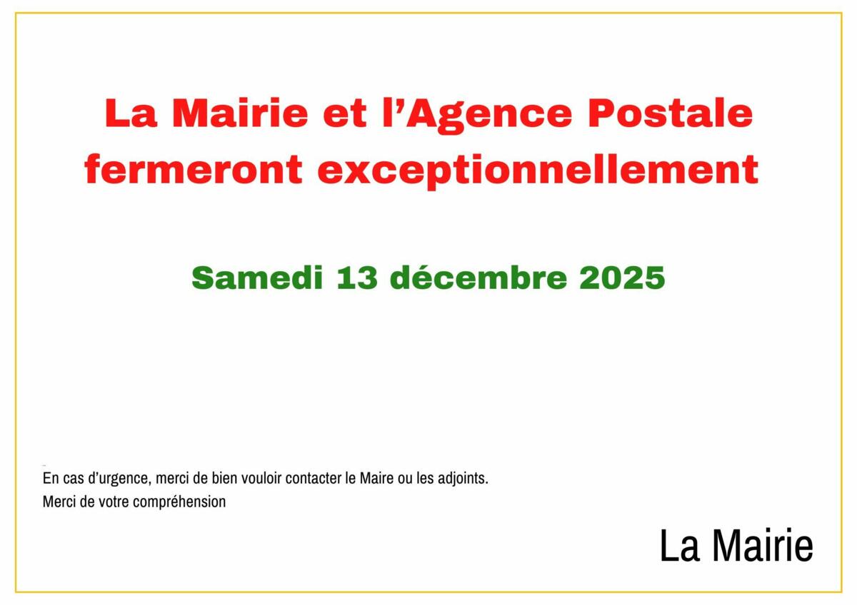 Fermeture Mairie / Agence postale - Samedi 13 décembre 2025