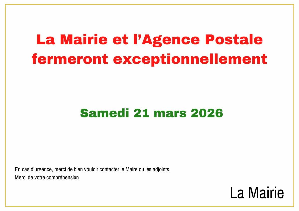 Fermeture Mairie/Agence Postale - Samedi 21 Mars 2026 20/03/2026 La Mairie et l'agence postale seront exceptionnellement fermées ce samedi 21 mars.