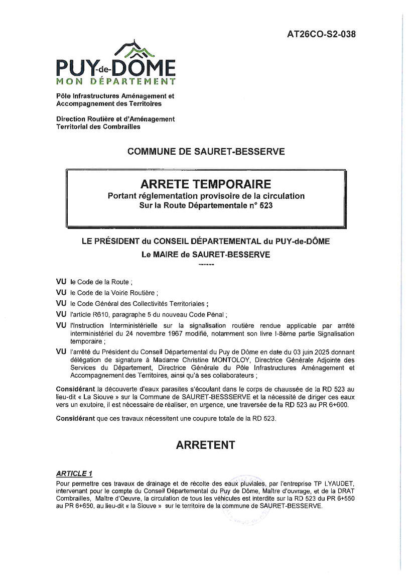 En raison des travaux d'aménagement de voirie réalisés par les services du Département , la RD 523 sera barrée et la circulation de tous les véhicules interdite  au lieu-dit La Siouve le jeudi 02 et le vendredi 03 avril entre 8 h 30 et 17 h 00.