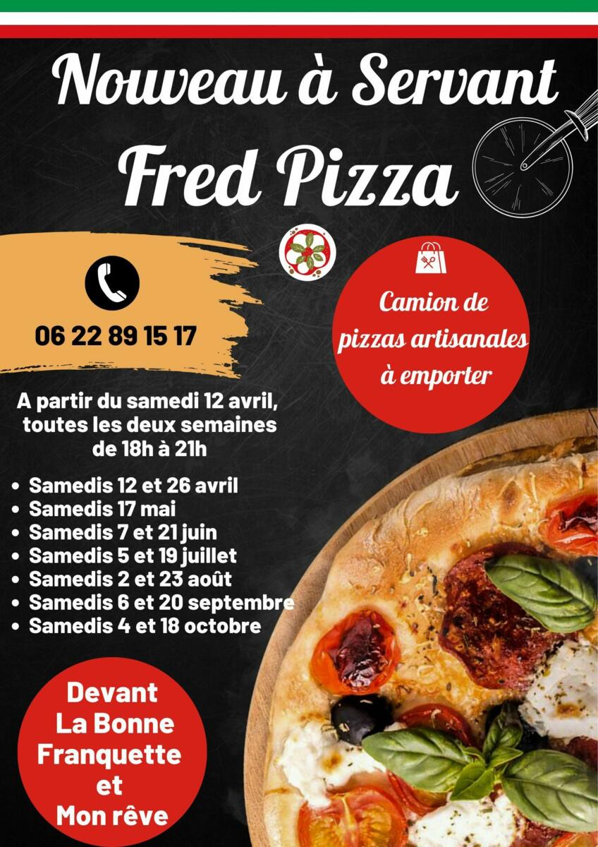 Nouveau sur la commune, le camion de Fred pizza sera présent à partir du 12 avril, un samedi sur deux devant "La Bonne Franquette" et "Mon Rêve" de 18h à 21h.