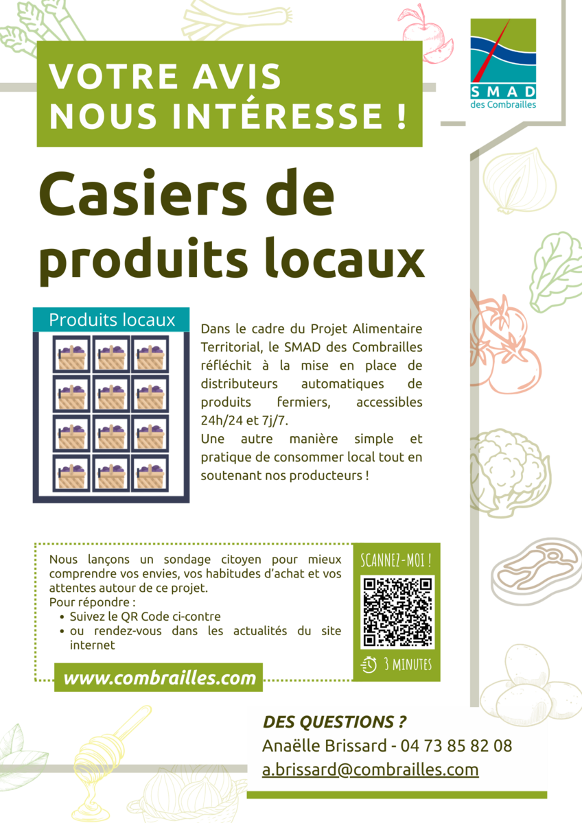 Dans le cadre du Projet Alimentaire Territorial (PAT) des Combrailles, porté par le SMADC, une réflexion est actuellement menée sur l’implantation de casiers distributeurs de produits locaux sur le territoire. Cette initiative viserait à proposer aux habitants une offre de produits alimentaires locaux accessible 24h/24 et 7j/7, tout en offrant un débouché complémentaire aux producteurs volontaires.