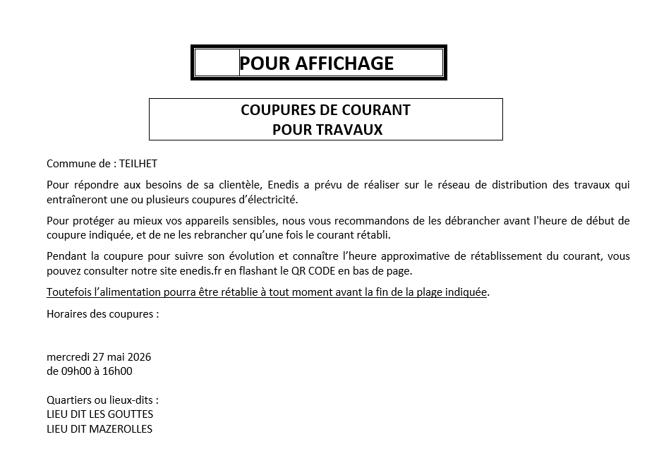 Votre mairie / Actualités / COUPURE DE COURANT PROGRAMMEE LE 27 MAI