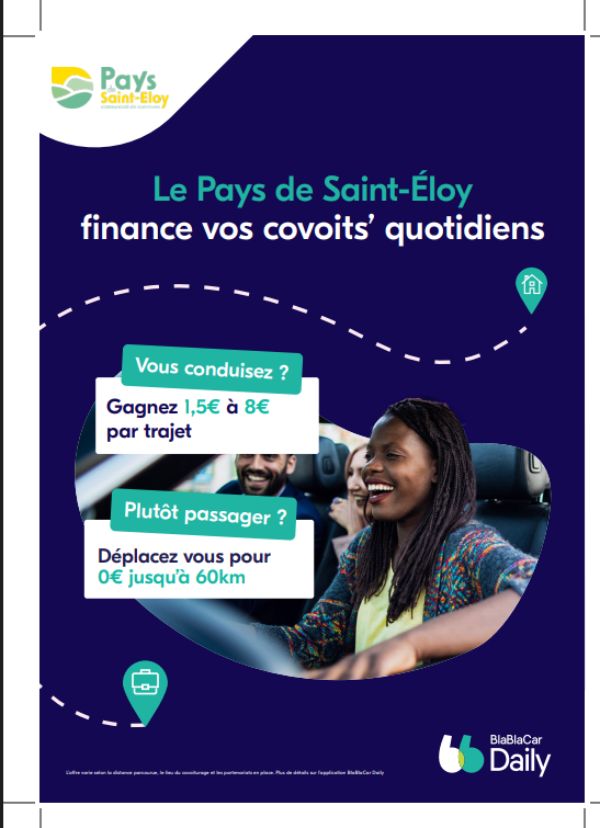Depuis le 1er septembre 2025, la Communauté de communes du Pays de Saint-Eloy finance et coordonne pour l’ensemble de ses habitants un service de covoiturage de proximité (domicile-travail, courses, rendez-vous culturels... ).