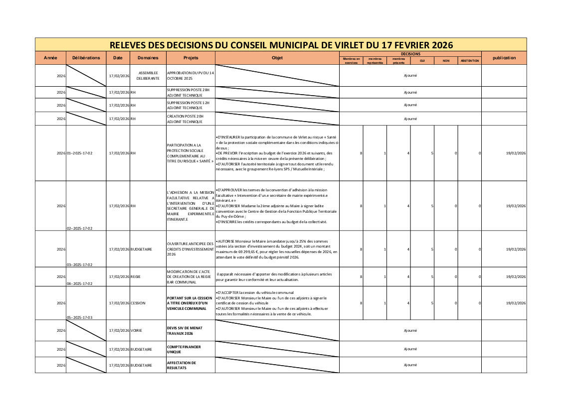 Veuillez trouver la liste des décisions prise par le conseil municipal en date du 17 février 2026.