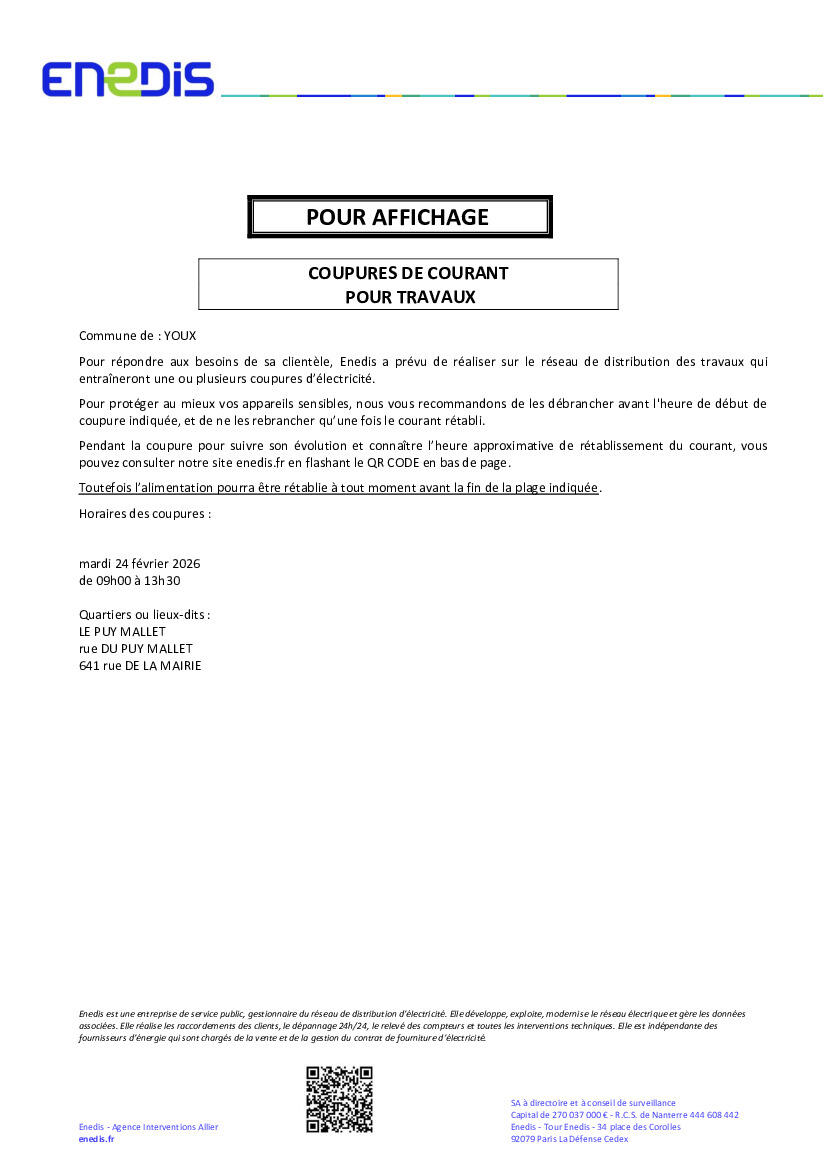 ENEDIS prévoit une coupure d'électricité programmée le mardi 24 février 2026