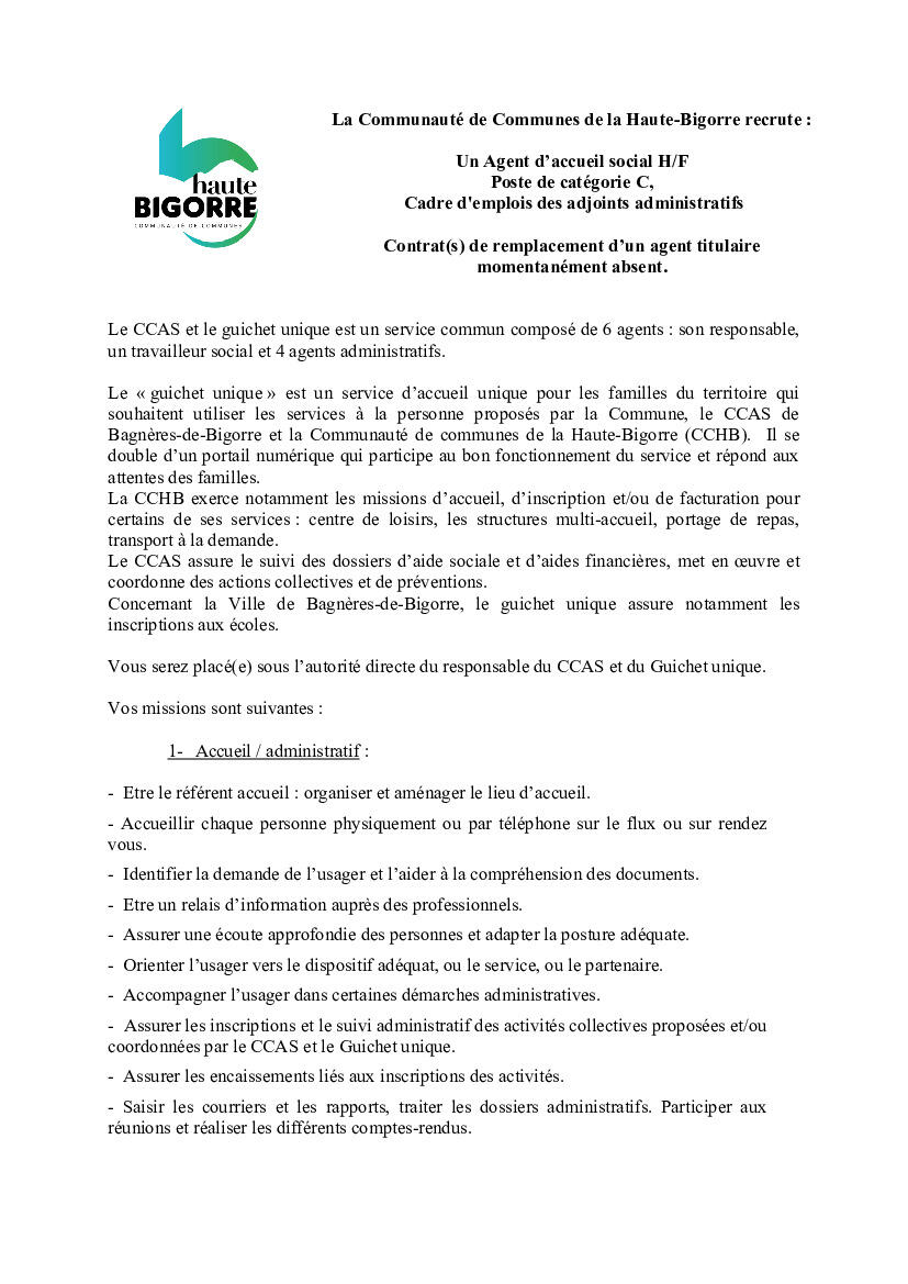 Offre d'emploi CCHB agent d'accueil social
