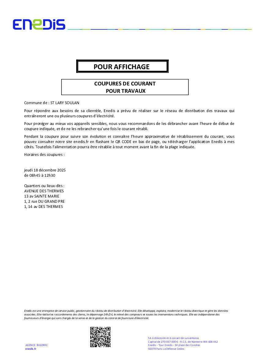Votre mairie / Actualités / Enedis vous informe d'une coupure de courant pour travaux