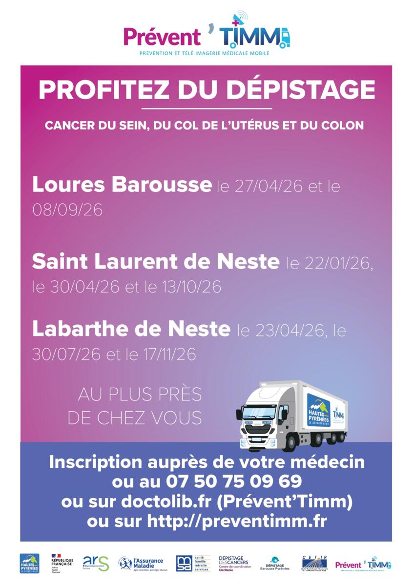 Le camion Prévent’TIMM est un dispositif dédié à la prévention santé et au dépistage organisé des cancers du sein, du col de l’utérus et du côlon. Il est piloté par le Département des Hautes-Pyrénées et l’ARS 65, en partenariat avec la CPAM, la MSA, la SELAS Dépistage Barousse Pyrénées, le CETIR ainsi que les professionnels de santé du territoire (médecins généralistes, sages-femmes…).