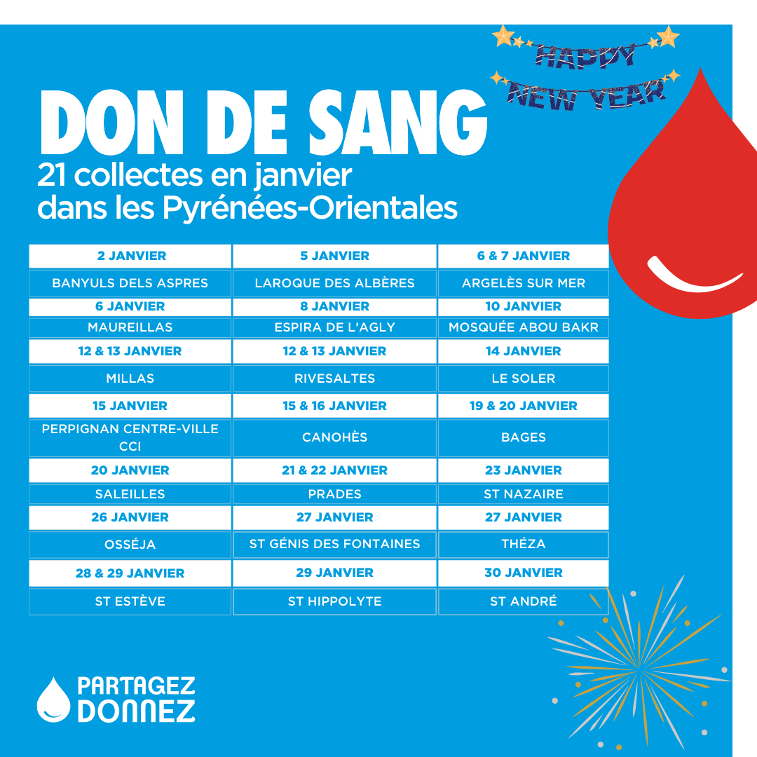Veuillez trouver ci-dessous une information de l’Établissement français du sang concernant le calendrier de collectes de sang dans les  P-O pour le mois de janvier 2026.