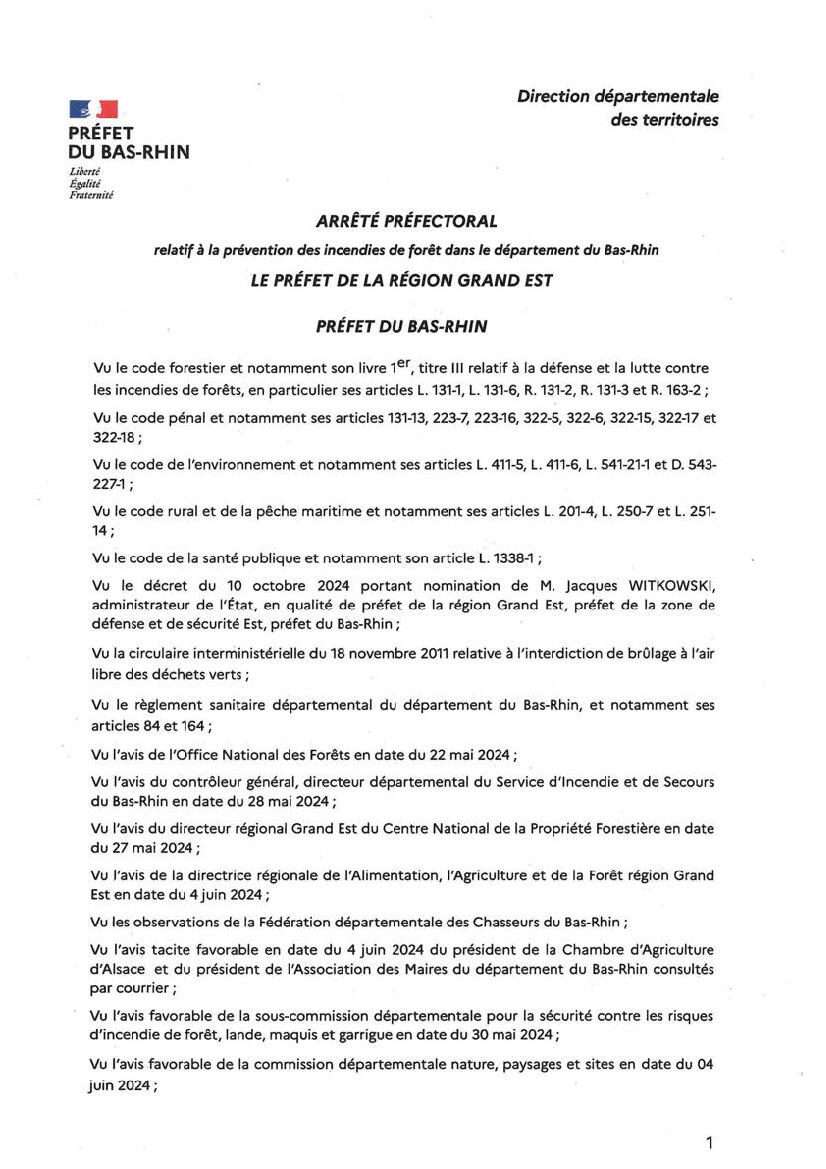 L'arrêté définit 5 secteurs (le Bas-Rhin est découpé en cinq zones de risque incendie), permettant une approche différenciée en fonction des risques et donnant lieu à des mesures de restriction de certains usages, dans et aux abords de la forêt.