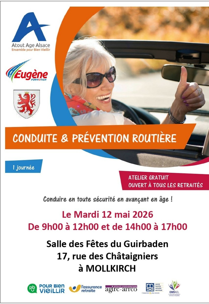L'Amicale des Retraités de Mollkirch, en collaboration avec Atout Age Alsace, propose un atelier de conduite automobile à l'adresse des séniors le 12 mai 2026 de 9h à 12 h et de 14h à 17h.