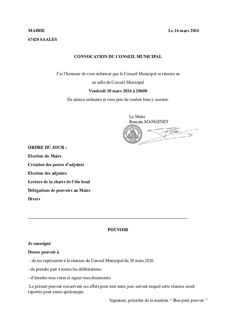 Le Conseil Municipal se réunira le vendredi 20 mars 2026 à 20h00 en salle du Conseil Municipal.