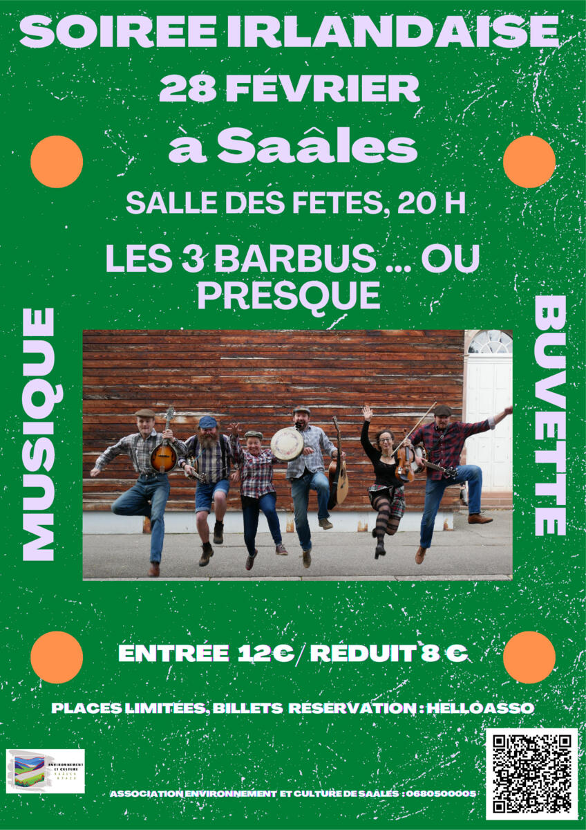 L’association Environnement et Culture est heureuse d’annoncer qu’elle organise  une grande soirée Irlandaise avec le 3 Barbus ou presque: le 28 février à 20 heures, salle des Fêtes de Saâles. Musique endiablée, buvettes et gâteaux façon irlandaise.
