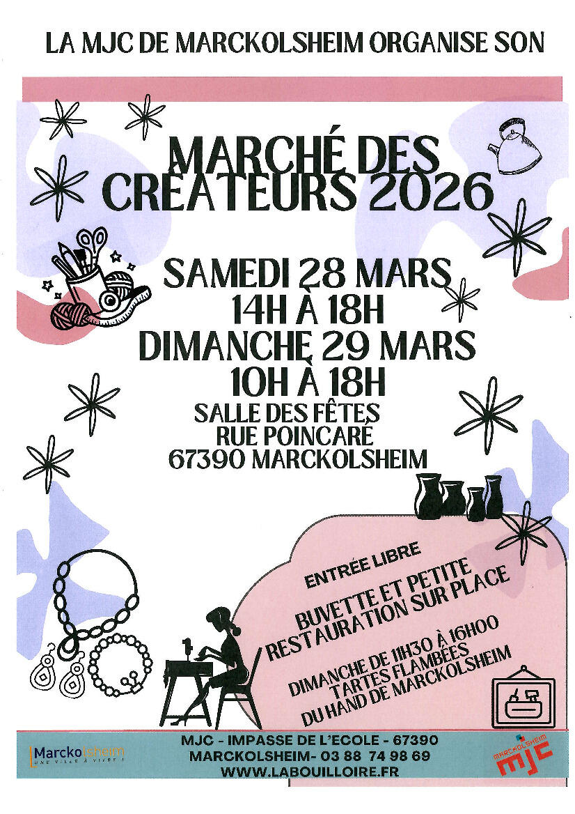 La MJC de Marckolsheim organise son Marché des Créateurs 2026 à la salle des fêtes de Marckolsheim :