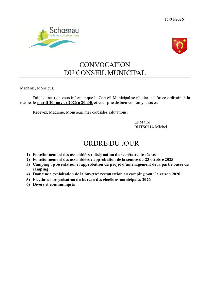 Ordre du jour conseil municipal du 20 janvier 2026 16/01/2026 Le conseil municipal se réunira le mardi 20 janvier à 20h00 à la mairie.