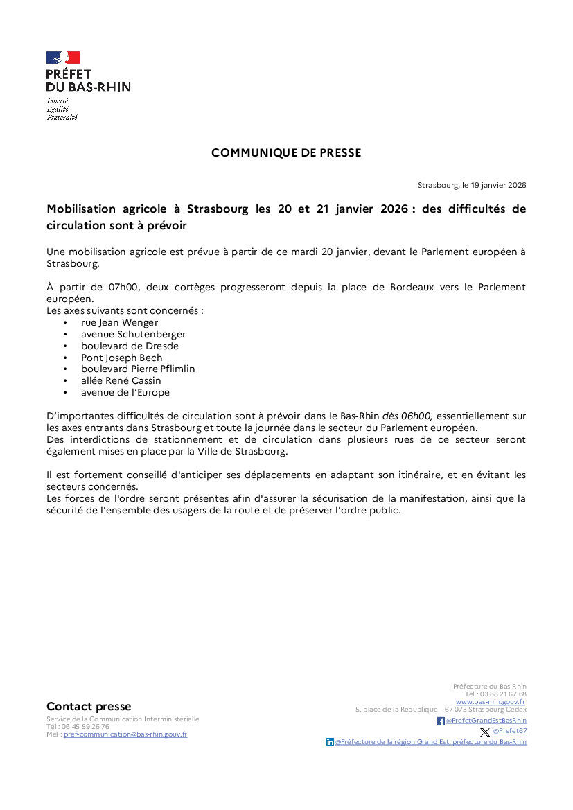 Mobilisation agricole à Strasbourg les 20 et 21 janvier 2026