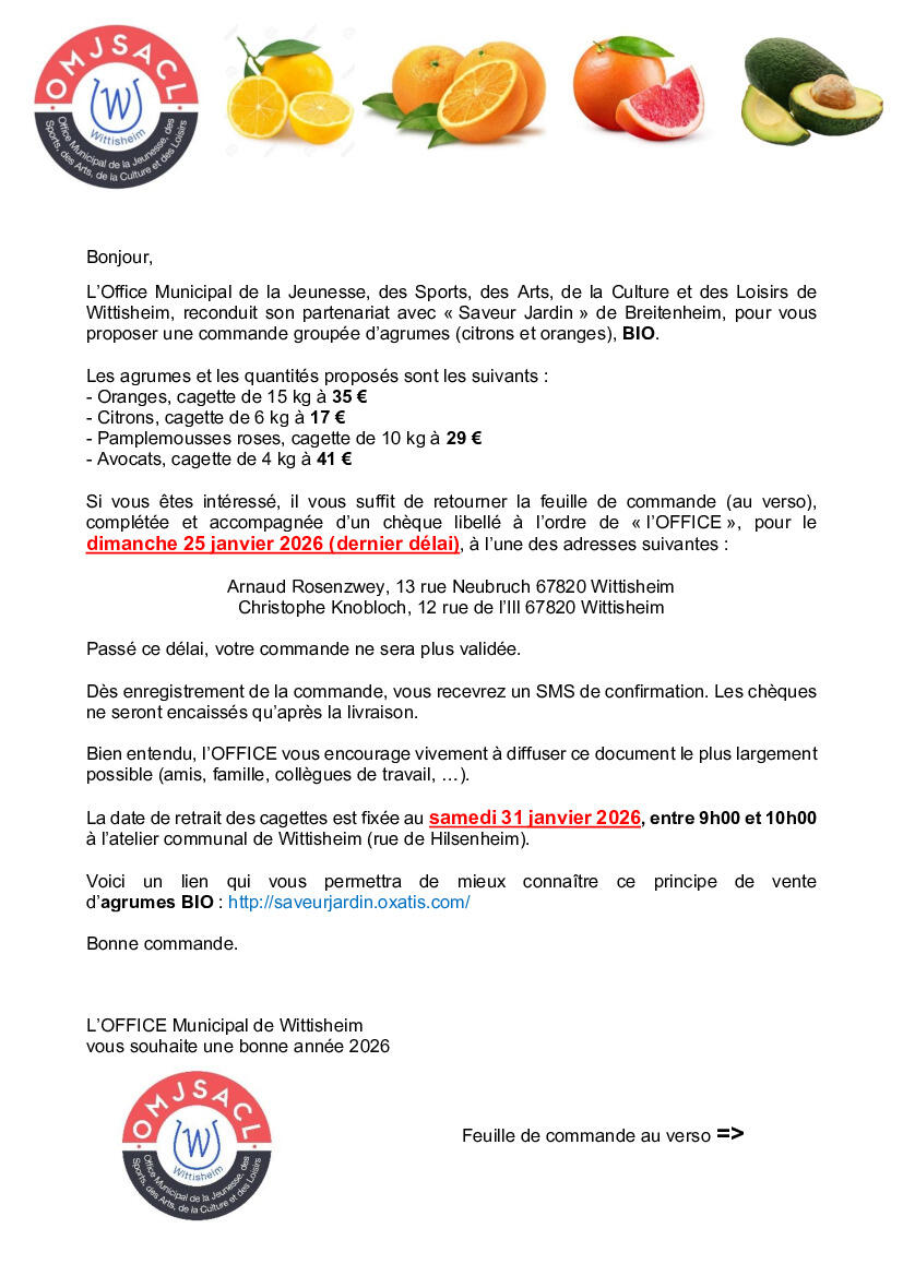 L’Office Municipal de la Jeunesse, des Sports, des Arts, de la Culture et des Loisirs de Wittisheim, reconduit son partenariat avec « Saveur Jardin » de Breitenheim, pour une commande groupée d'agrumes (citrons, oranges et pamplemousse) et d'avocats BIO. 🍊🍋🥑